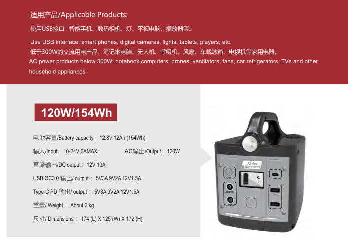 120W 154Wh戶外移動電站是上海攝海電子科技有限公司主營產品之一,公司多年來助力客戶產品制造和革新,提供整體解決方案,使客戶保持成本和技術的優勢,不斷提高客戶的產品競爭力。了解詳情請聯系021-56665510。